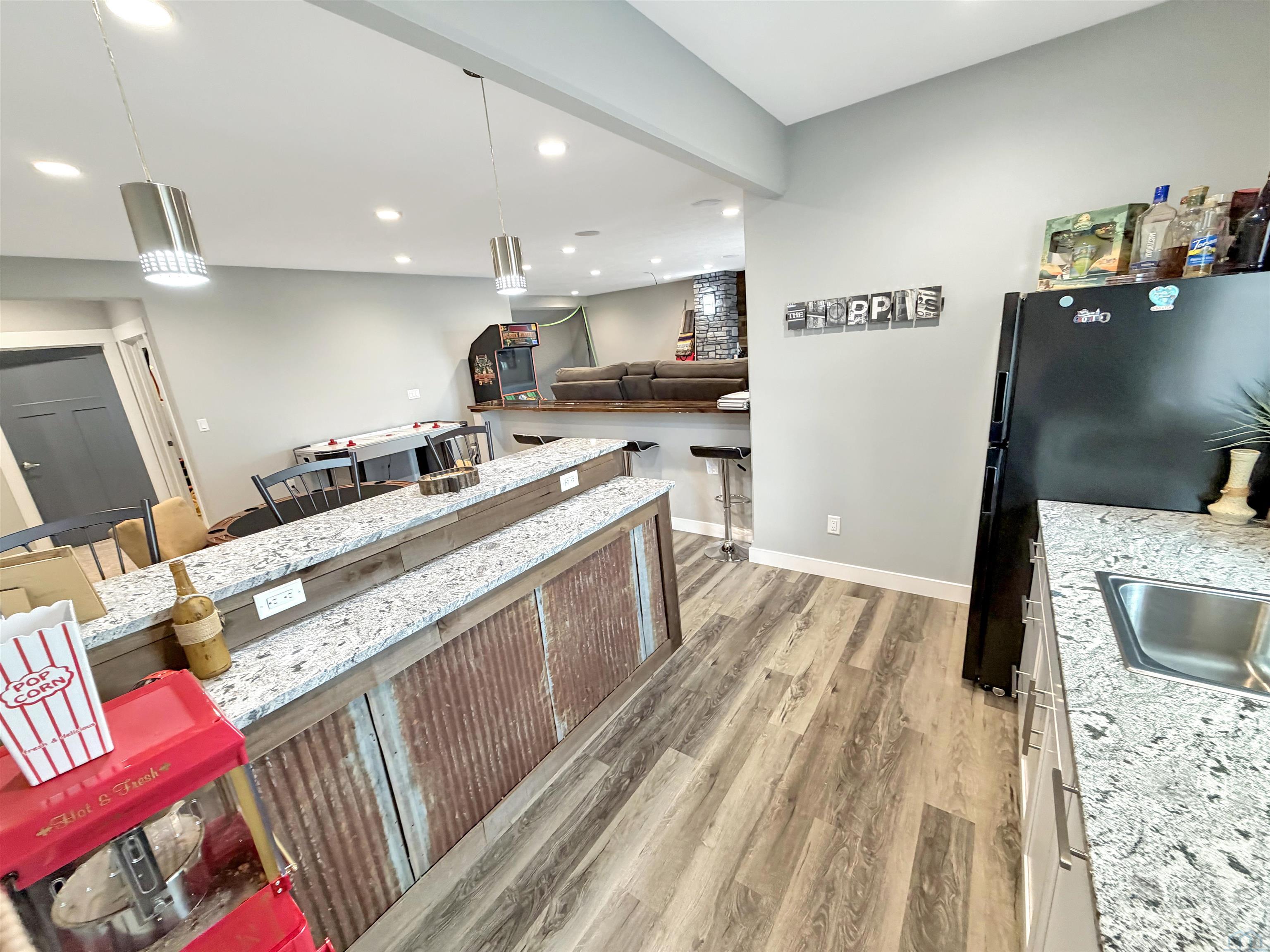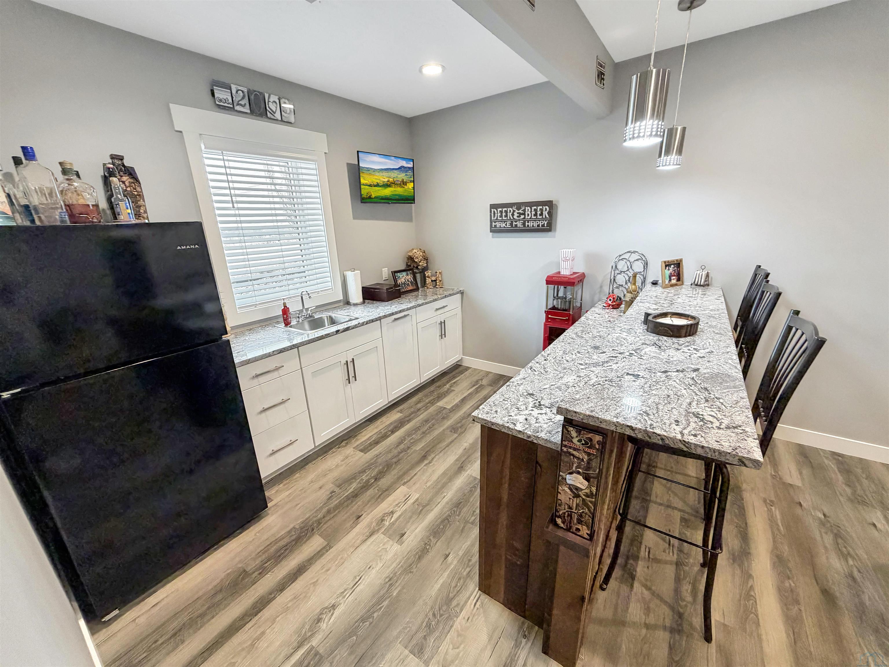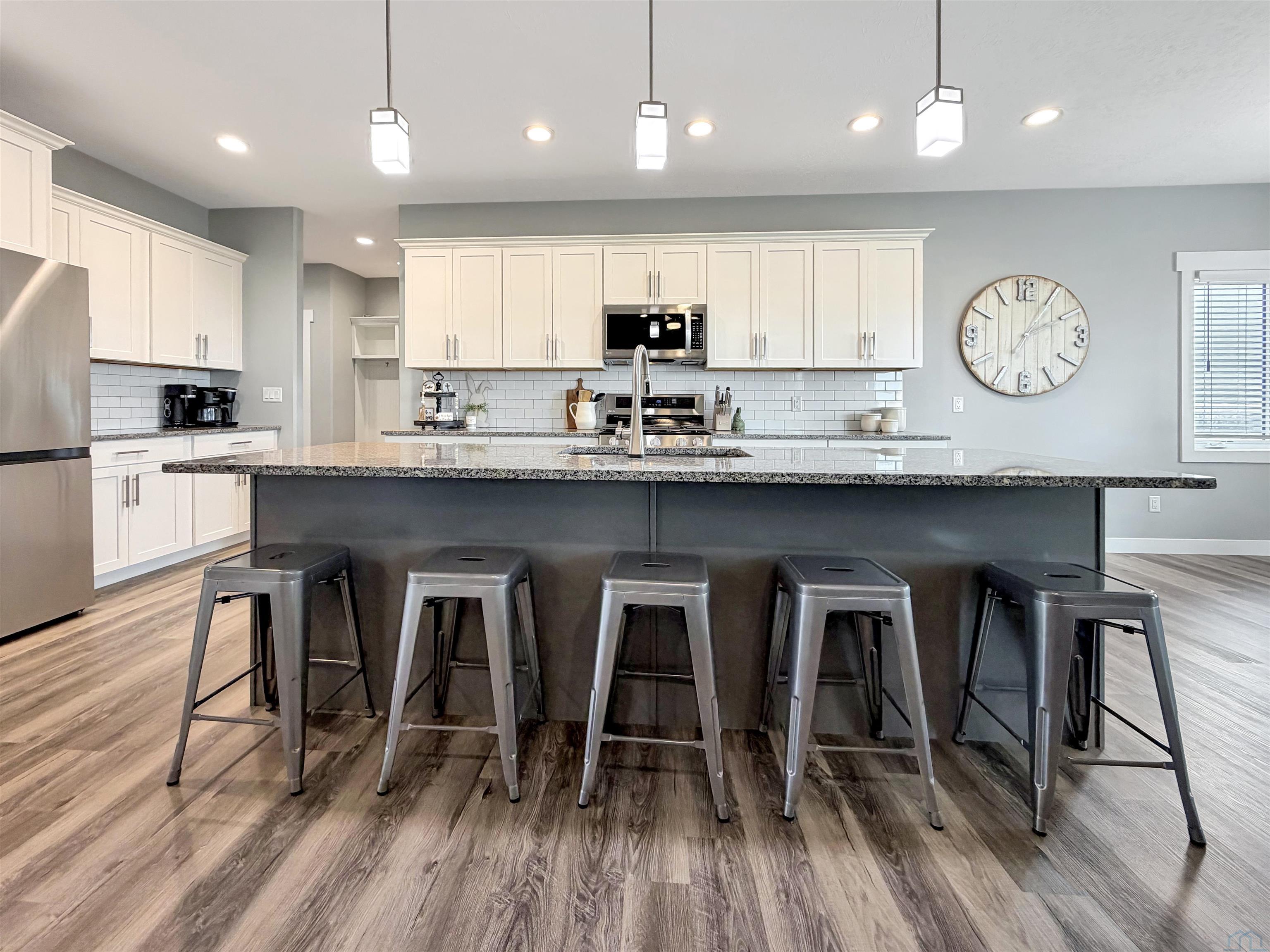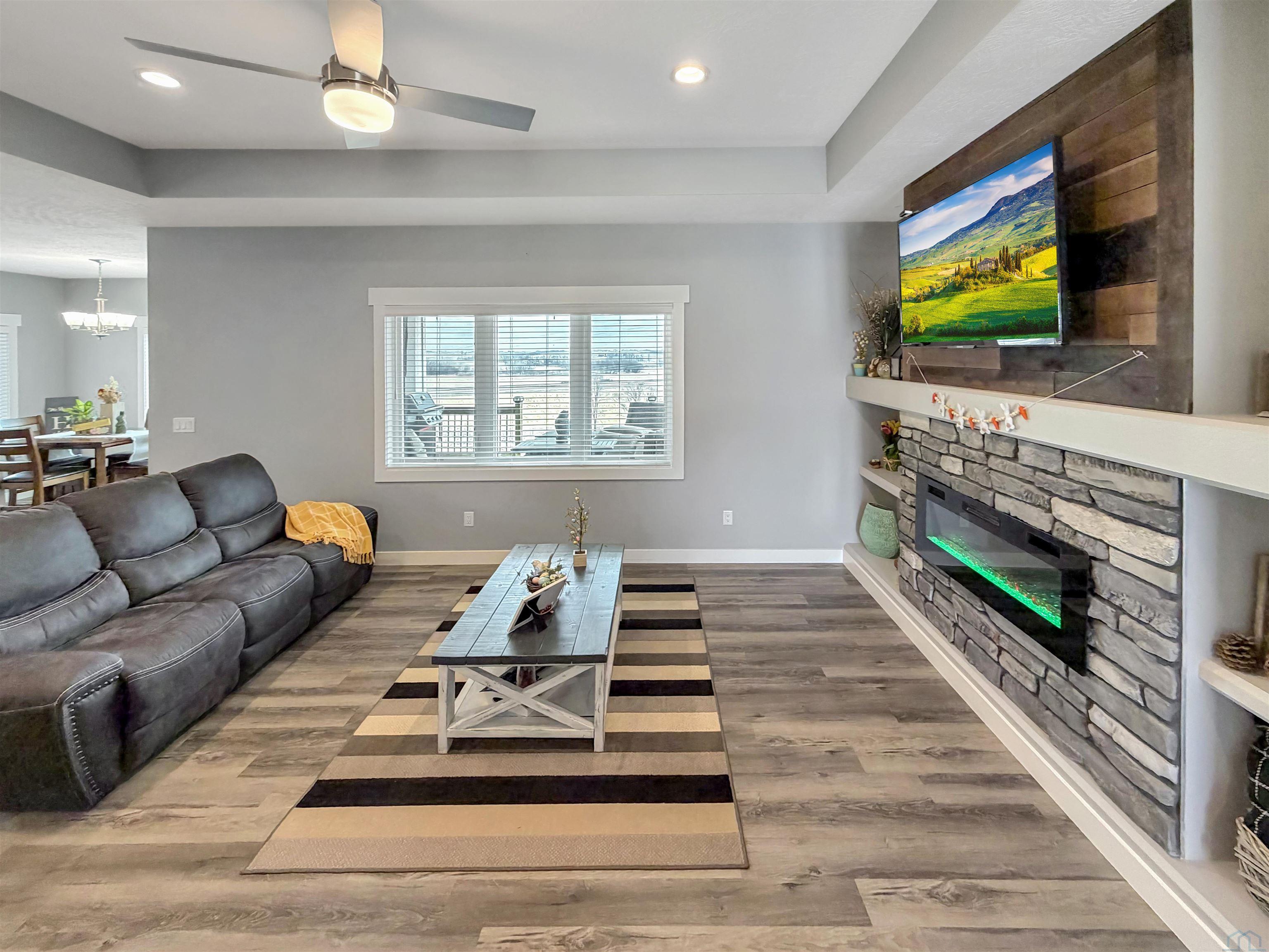 Beautiful custom ranch home in the Blackhawk Ridge addition in Hinton offering over 4,000 finished sq ft, 5 bedrooms, 3 bathrooms, plus a home office and gym. The open-concept main level features a spacious kitchen with granite countertops, large island with seating for 5+, abundant cabinetry, gas stove, hidden walk-in pantry, and brand-new refrigerator. Dining area with sliders leads to a covered deck with hot tub that stays, overlooking beautiful views with no backyard neighbors. The primary suite includes a spa-inspired tile shower with dual shower heads, built-in bench, and granite vanity. Custom built-in entertainment centers highlight both the main living room and finished basement, which also features theater seating, wet bar, and home gym. Two large basement bedrooms offer spacious walk-in closets. Additional features include extra wide basement staircase, mudroom with built-in bench and laundry, solid core doors throughout, oversized 3 stall garage, in-ground trampoline, and new roof, fascia, and garage doors. All appliances stay except garage freezers. Washer and dryer less than a year old. Built in 2020, this home sits on a large lot with incredible views.