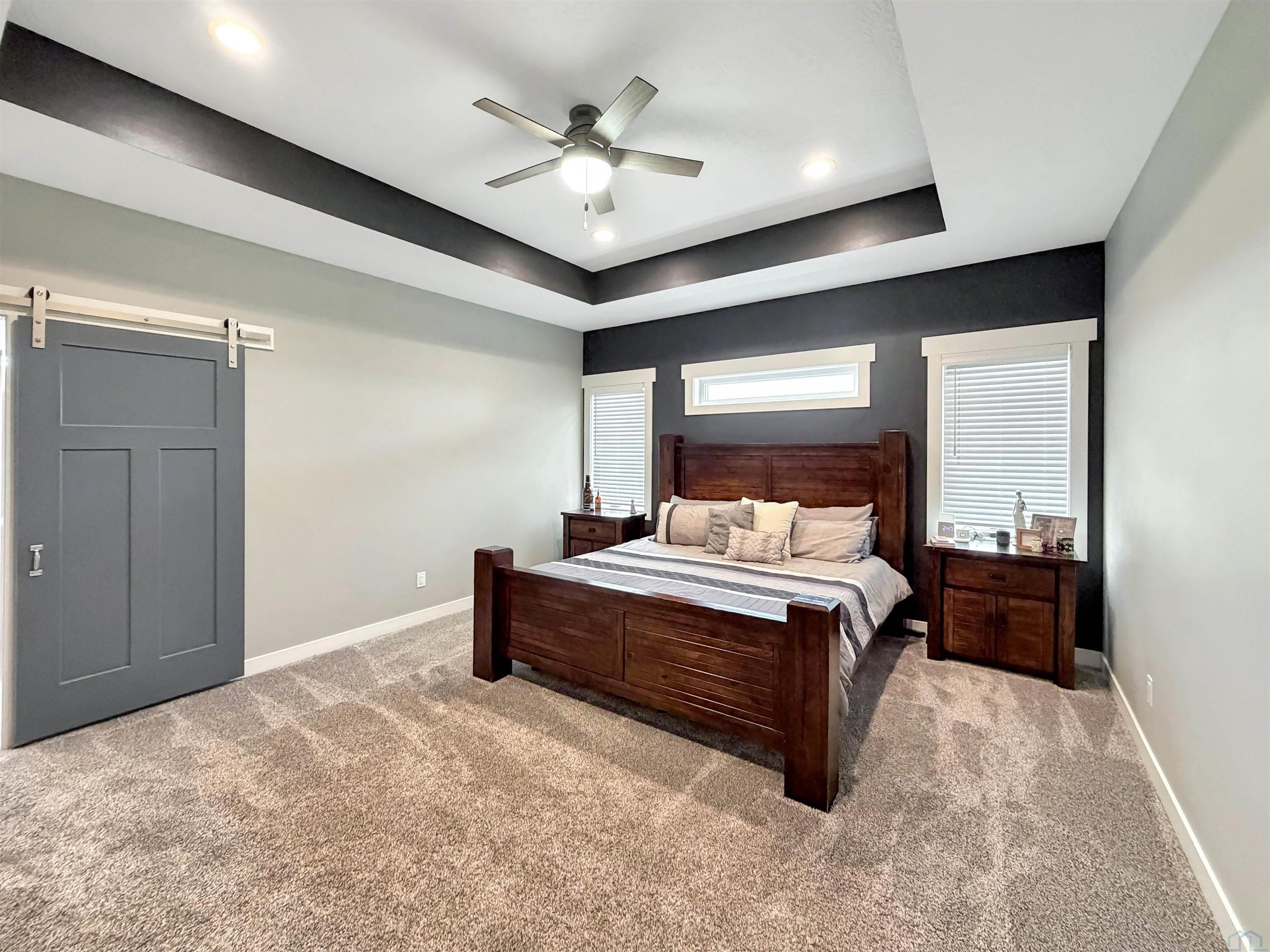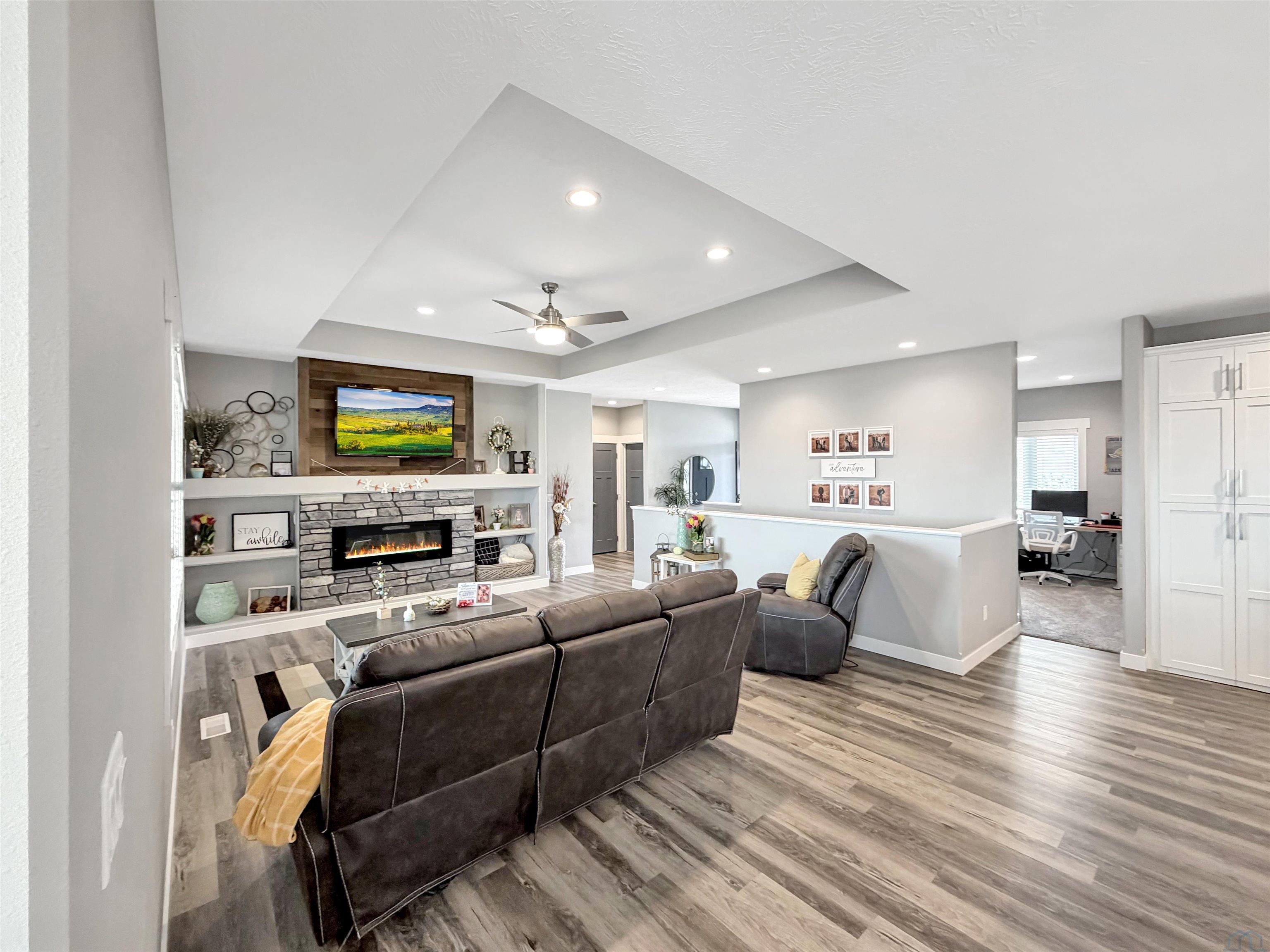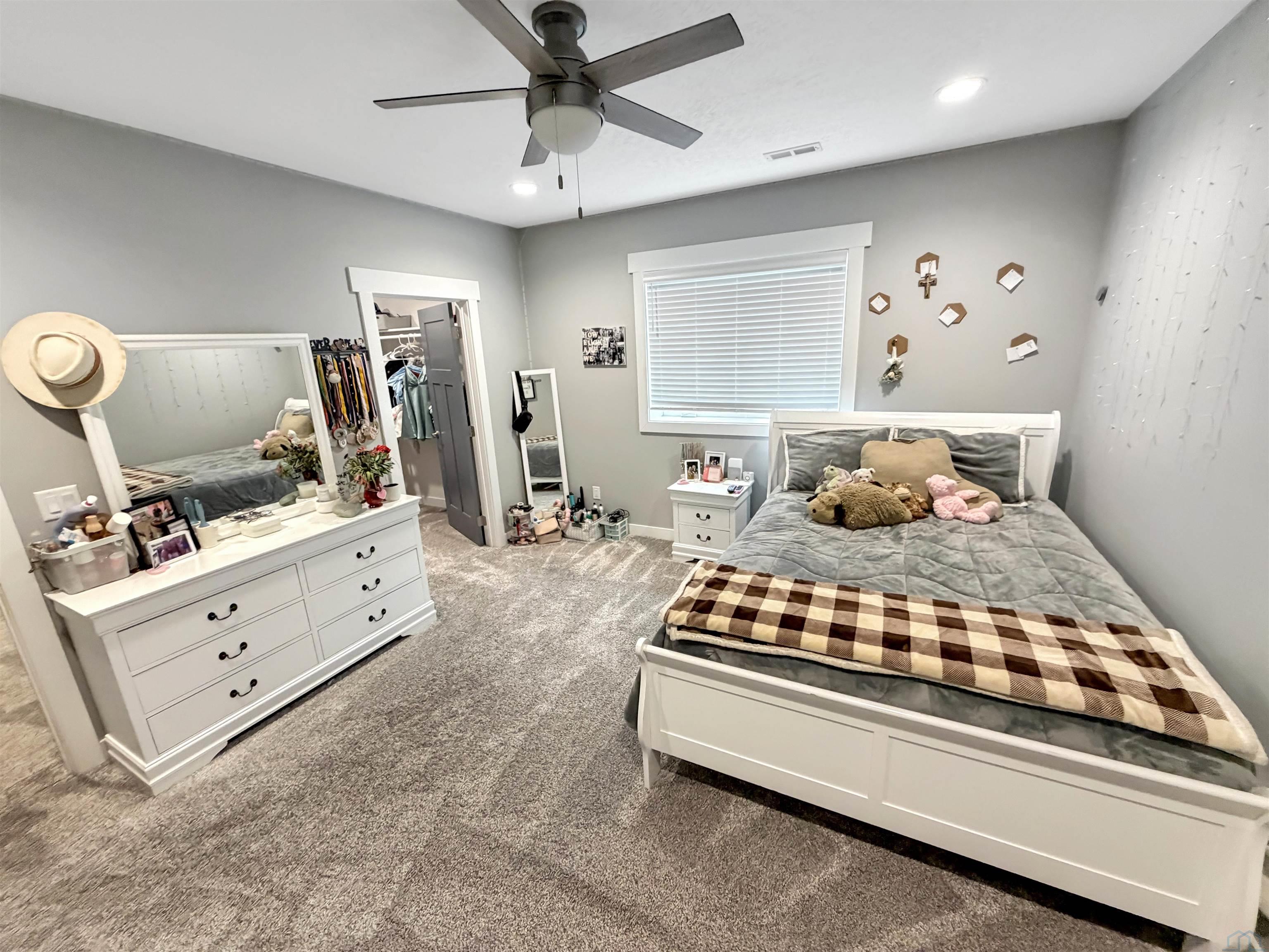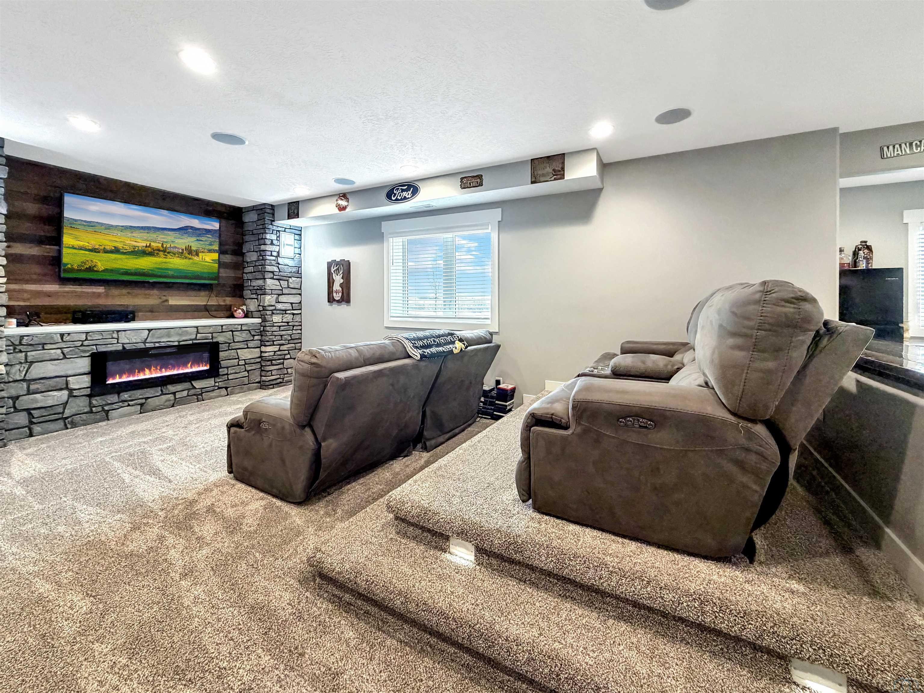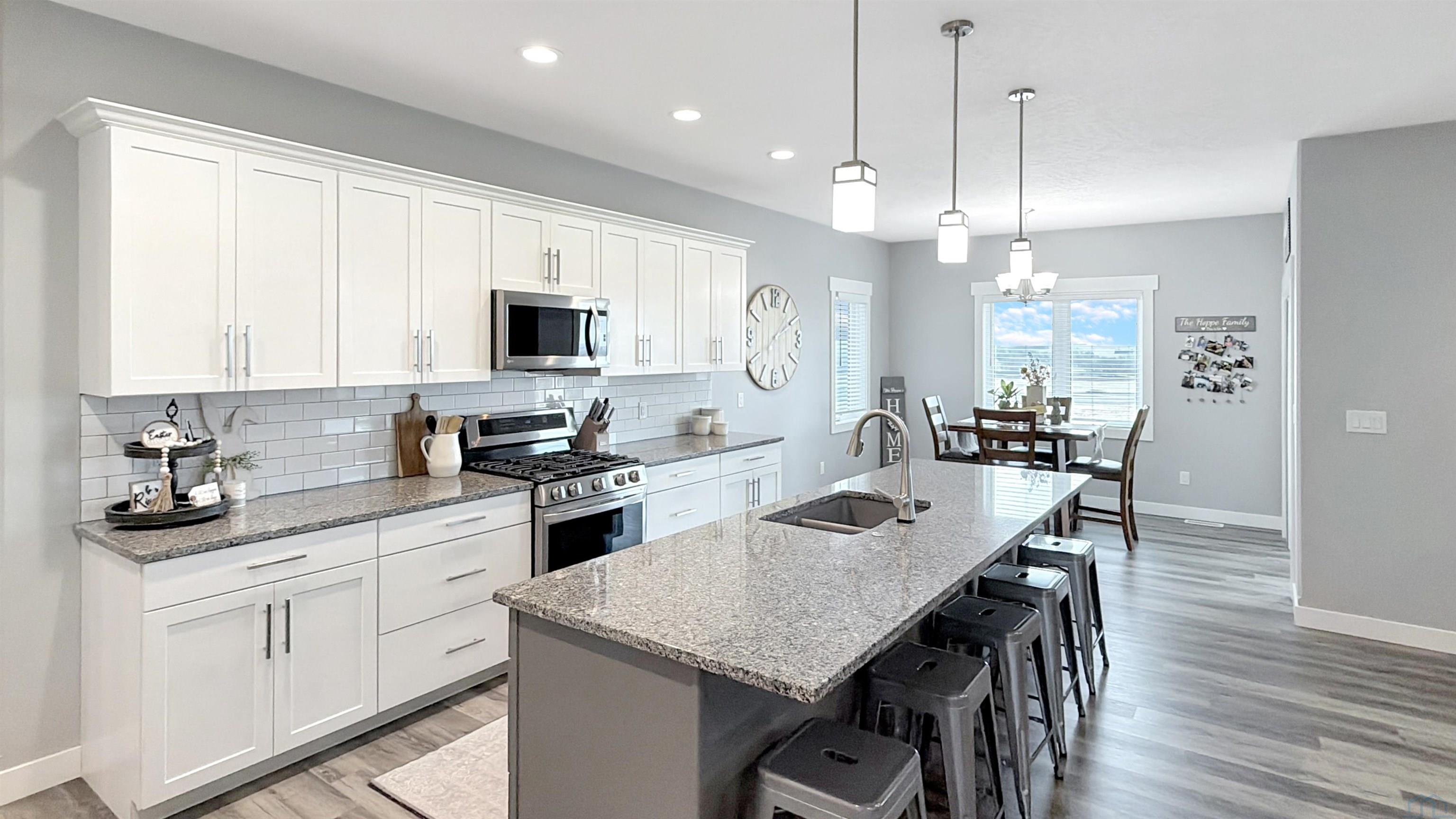 Beautiful custom ranch home in the Blackhawk Ridge addition in Hinton offering over 4,000 finished sq ft, 5 bedrooms, 3 bathrooms, plus a home office and gym. The open-concept main level features a spacious kitchen with granite countertops, large island with seating for 5+, abundant cabinetry, gas stove, hidden walk-in pantry, and brand-new refrigerator. Dining area with sliders leads to a covered deck with hot tub that stays, overlooking beautiful views with no backyard neighbors. The primary suite includes a spa-inspired tile shower with dual shower heads, built-in bench, and granite vanity. Custom built-in entertainment centers highlight both the main living room and finished basement, which also features theater seating, wet bar, and home gym. Two large basement bedrooms offer spacious walk-in closets. Additional features include extra wide basement staircase, mudroom with built-in bench and laundry, solid core doors throughout, oversized 3 stall garage, in-ground trampoline, and new roof, fascia, and garage doors. All appliances stay except garage freezers. Washer and dryer less than a year old. Built in 2020, this home sits on a large lot with incredible views.